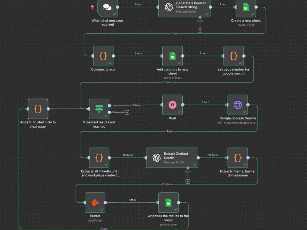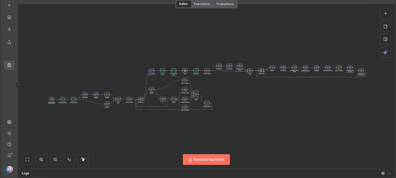 The final n8n workflow (shown in the screenshot) is a multi stage pipeline with clearly separated blocks.