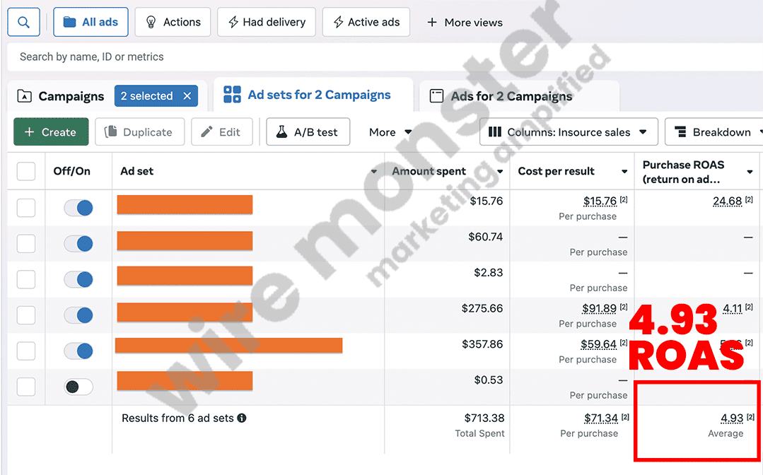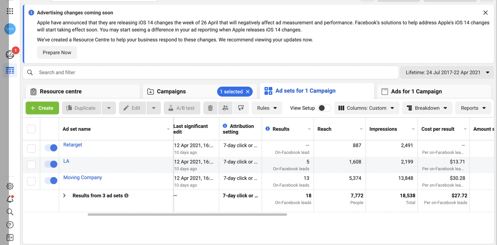Separate campaigns and ad sets were built for each stage of the funnel.